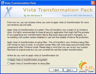 下面以Vista Transformation Pack为例介绍如何将Windows XP的外壳更换为类Vista风格。Vista Transformation Pack是一款由WindowsXLive.net提供的优秀免费软件,目前的最高版本为Vista Transformation Pack V5.5,在许多人的测试中,无论在稳定性、兼容性方面都是同类软件中最好的,