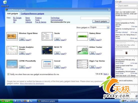 另一个替代方案则是Google桌面。同微软Windows 桌面搜索类似,Google桌面同样采取了基于任务栏的搜索方式,并在搜索性能上有自己的优势。此外,Google桌面集成了类似Windows Vista中Sidebar的功能。——当然,与Windows Vista中的Sidebar区别还是蛮大的。