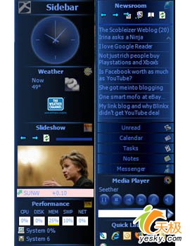 对于那些除了功能方面之外,更多地考虑达到近似于Windows Vista中Sidebar显示效果的用户来说,可以尝试一下Desktop Sidebar。Desktop Sidebar是一款免费软件,在能够提供的功能方面远非Windows Vista中目前为止仍区区可数的Gadgets数量所可比拟,当然,最重要的是,其界面非常类似于Windows Vista。
