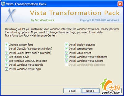 同时,Vista Transformation Pack最大的优点还在于向用户提供最大程度的控制,由用户决定替换当前Windows XP界面中的哪些内容或者在哪些方面保留原样不做改变。从安装过程开始,即提供一系列的选项让用户选择,如直接将Vista风格的用户接口应用到系统中还是将安装文件转换为Vista风格,使用自动安装还是手动设置等。
