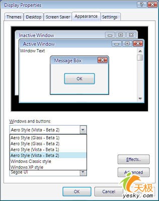 安装完成后,打开显示属性,可以看到可以选择的桌面风格远不止单纯的“Areo”,事实上,在Vista Transformation Pack V5.5中,几乎囊括了Windows Vista各个测试中曾经出现过的各种GUI接口,供用户从中选择。不过,客观说来,这些不同的GUI接口间的区别,事实上并不算太大。