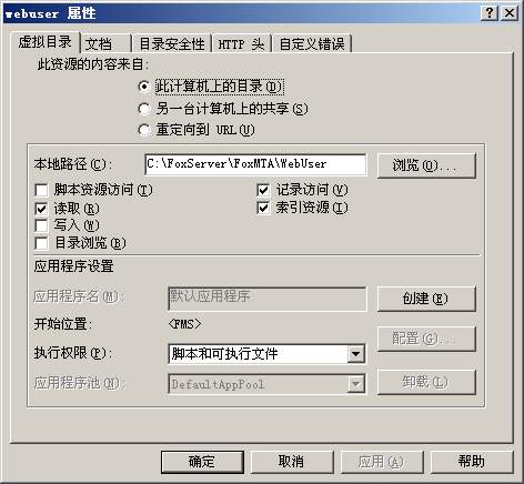 1)."WebUser"虚拟目录,目录路径为"FoxMTA\WebUser"。