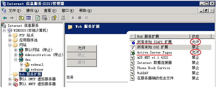 在Web服务器扩展里必须设置允许ISAPI扩展和Active Server Pages,如下图: