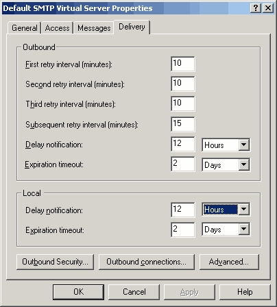 在这个标签中值得一提的另一个方面是延迟通知(Delay Notification)设定。做为默认值,Exchange是如上图这样对其进行设置的,如果信息在12小时内不能被发送,那么发送方将会收到一条消息,提示信息还没有被发送出去,然而现在还没有必要对其进行重新发送。你可以把通知的时间从12个小时改为任何适合你所需要的时间。