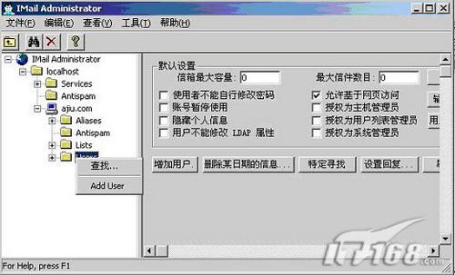 1) 打开IMail Administrator 主窗口,在左窗格中选中Users,单击右键,如图11