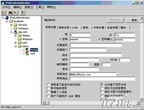 6) 单击左窗格中的users下面的Mymail就可以看到Mymail的基本属性了,如需要配置其他基本属性可选择其他选项卡如“使用目录”,“计划”等,如图16