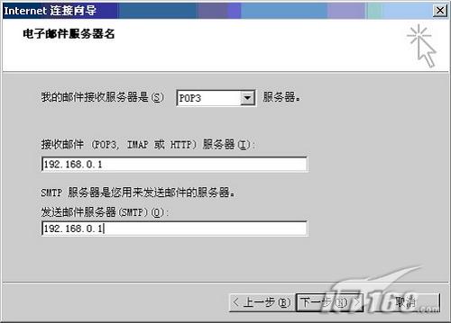 d) 单击“下一步”按钮,为邮箱配置接收邮件服务器(POP3)以及发送邮件服务器(SMTP),在这里我们必须输入IMAIL SERVER服务器软件安装的主机的IP地址作为接收和发送邮件的服务器地址。如图23