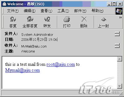 i) 接收以后,我们发现当前用户MyMail@ajiu.com有一封新邮件WelCome,来自root@ajiu.com,至此邮件的发送和接收测试完毕,今后就可以自由的发送局域网内部的邮件了。,如图27