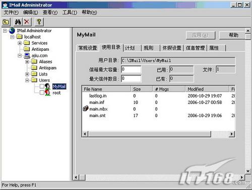 新创建的用户邮箱基本属性配置完成后,可进行邮箱测试,可选择Imail client或者其他邮件代理工具如OUTLOOK EXPRESS和FOXMAIL来发送接收邮件.