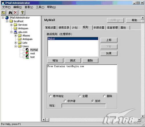 2) 规则:主要为拒收邮件而设定,假设我们在规则中增加发件人地址为Test@ajiu.com;规则为拒收,那么今后从Test@ajiu.com发送给Mymail@ajiu.com的邮件将无法传送到Mymail@ajiu.com中。如图29