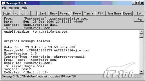 而在Test@ajiu.com邮箱中将收到一封来自系统退回信件通知。如图30