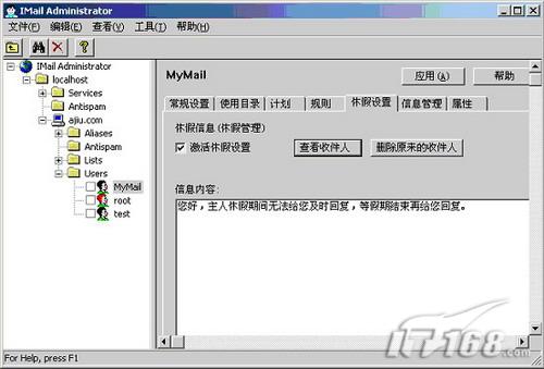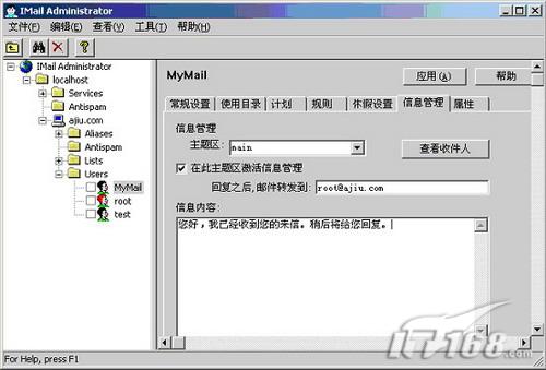 4) 信息管理:此选项卡为自动回复和自动转信而设置,当前用户MYmail在收到每一封邮件后将给发件人一封自动回复信件,包含其信息内容,并且可将此信件转发给root@ajiu.com,这也是和“休假设置”的不同之处。如图32