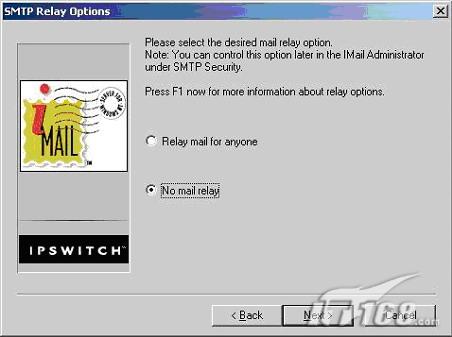 5) 单击NEXT按钮,打开SMTP Relay Option对话框,如图5,在这里我们选择默认的No mail relay