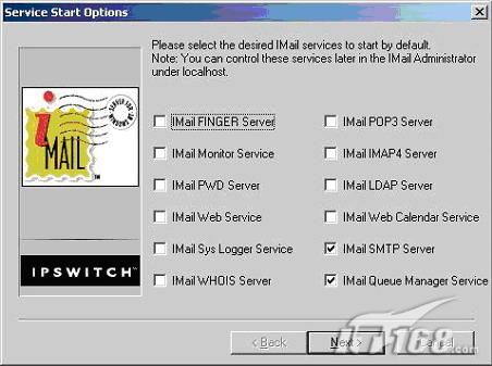6) 单击NEXT按钮,打开Service Start Options对话框,在框中,我们可以选择IMAIL的默认启动服务。默认情况下选择的是IMail SMTP server和IMail Queue Manager Service复选框。如图6