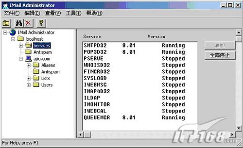 IMAL Administrator主窗口启动后,首先应该查看其服务启动情况,根据具体需要可启动多个服务,启动时先选择主窗口左窗格中的Services,在右侧窗口中选择需要启动的服务,然后单击“启动”按钮。如启动SMTPD32、POP3D32、QUEUEMGR服务等。如图9