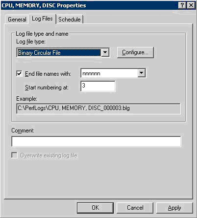 Windows Server 2003 和 Windows XP 提供了更多的日志记录选项。例如,您现在可以将日志记录到 SQL 数据库中。您还可以将日志记录到一个循环文件中,这表明可以预先定义日志文件的大小。然后,随着监视过程的进行,如果文件被填满,将再次从文件开头记录数据(覆盖原先记录的内容)。如果您需要长期监视服务器,可以让系统监视器运行数天或数周,然后在问题再次发生后停止它的运行。
