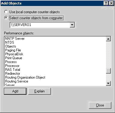 Windows NT Server 4.0 性能监视器 (Perfmon) 允许您一次将所有对象添加到监视器中。Windows 2000 Server 操作系统中未提供此功能,但是也存在一种解决办法,我们可以使用 Windows Server 2000 Resource Kit 中的 Perfmon4.exe 文件。Windows Server 2003 操作系统提供了此功能。在 Windows Server 2003 中,若要设置日志,可单击添加对象按钮。