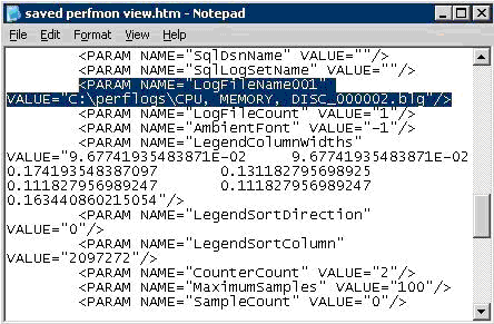 这样,便可将当前视图保存为 HTML 页面。现在,您可以将此页发送到其他计算机进行查看。为了正确打开此文件,您需要拥有从中获得数据的实际性能日志,而且该日志的保存位置必须与另存为 HTML 页面时所在的位置相同。该 HTML 页面通过一个 Microsoft ActiveX 控件来显示实际日志文件中的信息。可以在该 HTML 页面中查看 Perfmon 日志文件的位置和名称并对其进行修改。例如,如果您在记事本中打开该页面,可以搜索 LogFileName001(如果您当前只在查看一个日志文件)。如果需要,可修改日志文件的路径和名称。