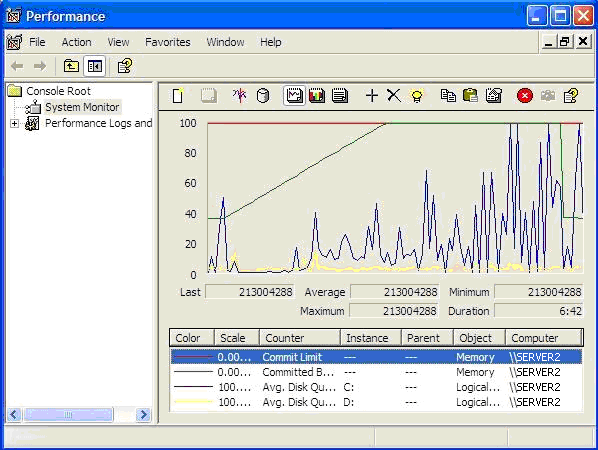 若要删除垂直线,可更改运行 Windows Server 2003 或 Windows XP 的服务器上的注册表项,提高包含大量信息的图形的可读性。更多相关信息,请参见微软知识库文章 283110:系统监视器工具中显示的垂直线让图形视图变得混乱." 下图显示了同一个图形在对注册表键进行更改后的样子。