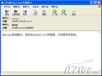 此外Mail2MO还提供类似“邮件回执”的服务,即用户在发送短信后系统会自动发送一封邮件提示用户适才的短信已成功发送。