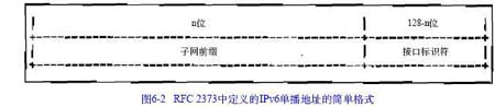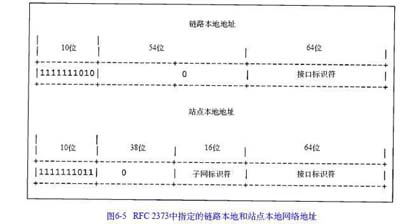 为实现这一功能,IPv6从全球唯一的Int e r n e t空间中分出两个不同的地址段。图6 - 5,源自RFC 2373,显示了链路本地和站点本地地址的结构。