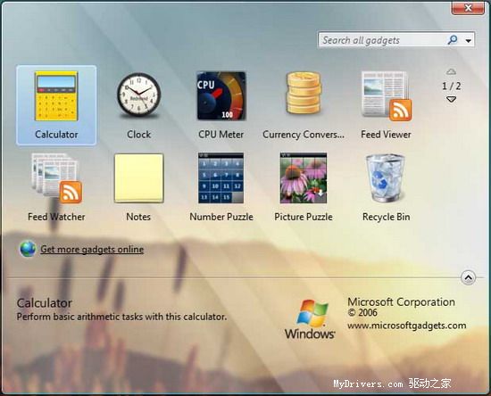 目前,Vista Sidebar仅有21个Gadgets可供使用,Windows Live则高达280个--可惜并不与Vista兼容。虽然Vista Sidebar的整体设计十分出色,但是对于程序员和网络开发人员来说,Gadgets开发难度应该再降低一些。