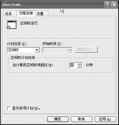 第3步 双击“任务计划”窗口中的“ShutdownComputer”快捷方式,在弹出的窗口中点“日程安排”选项卡,单击“计划任务”下拉式列表框,从中选择“空闲时”,在“当计算机空闲时间超过XX分钟处将时间间隔改为你认为合适的时间间隔,比如25分钟,如图所示。建议将时间间隔设为15~30分钟,因为设置的时间过短,反复开关机会影响计算机寿命,设置的时间太长则无法达到保护我们系统的目的。