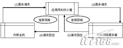 应用网关防火墙有多种实现方法。代管型防火墙把一些不安全的服务,如:Telnet、FTP等,移放到防火墙主机上,使防火墙同时充当服务器,回应来自外部网络的服务请求;另一方面,当内部网络需要访问外部网络时,必须先登录到防火墙上,再向外发送请求。