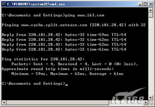 该提示表示无法识别的主机,出现这个问题之后是不是就表示目标主机一定有问题呢?当然不能!因为我们使用Ping命令去连接目标主机名称时,主要使用DNS来负责将名称转换成IP地址。例如“Ping www.163.com”,我们看到的返回信息是“Reply from 220.181.28.42: bytes=32 time=59ms TTL=54”,而不是“Reply from www.163.com: bytes=32 time=59ms TTL=54”,这就说明我们IP设置中的DNS服务器将www.163.com成功转换为220.181.28.42(图2)。因此当我们看到这样的提示时,就应该检查DNS设置是否正确、DNS工作是否正常。