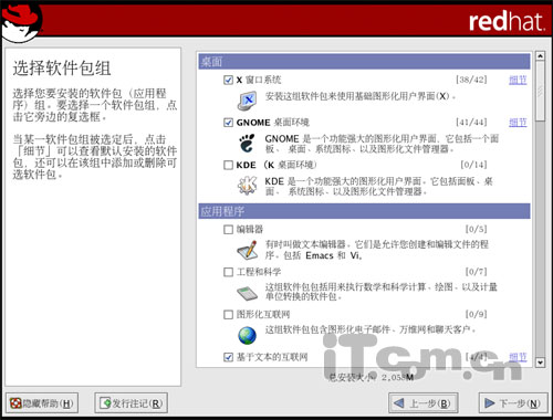 7、软件包安装选择,在这里提供有二个单选框:默认的软件包与定制安装的软件,如果你只需要尝试一下Linux,可直接选择默认的选择,单击下一步进行安装。也可以根据不同的应用,选择定制安装软件。如图12