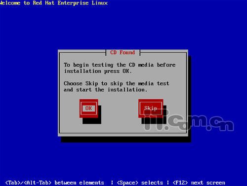 2、光盘检测,主要是测试Red Hat Enterprise Linux 4.0光盘的完整性,建议没有用光盘安装过的测试一次。否则安装到一半因光盘文件损失退出损失更大。