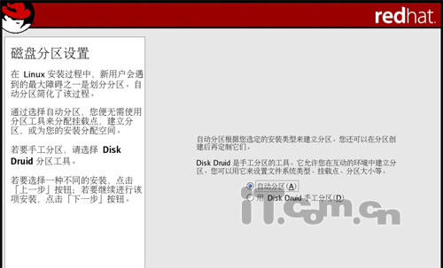 4、磁盘分区,有二个单选按钮,自动分、与手工分区。如果你的系统已装有其它Windows操作系统并有相应的空余磁盘空间,建议使用手动分区。并把SWAP(交换分区)分为本机内存的2倍,余下的做为Linux "/"分区。在这里,笔者选择了自动分区。