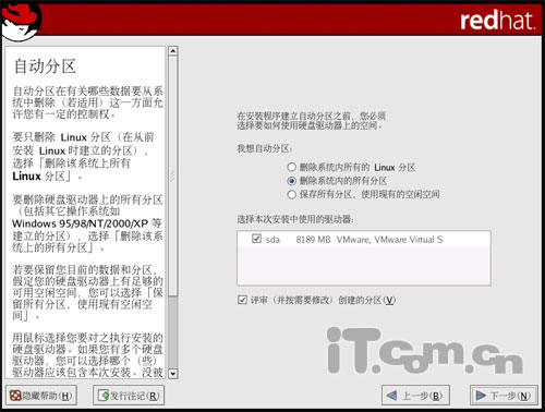 Redhat AS4自动分区提示,可根据自己的需求选择相关的选项。(图5)