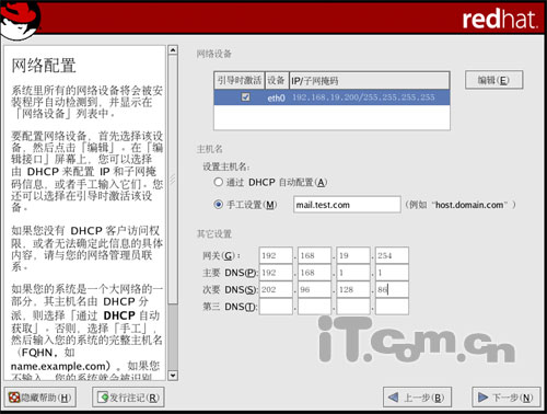 5、网络配置,Redhat AS4自动检测到网卡,出现网络设置对话框,需根据自己所处的网络情况,填入相应的IP地址与网关等。如图7