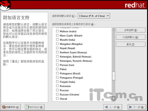 6、设置了网络之后,将出现操作系统语言设置对话框,在这里,选择相关的语言支持与默认的语言包,图9就选择了中文作为系统的默认语言。