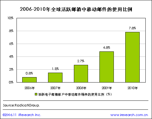 iResearch艾瑞市场咨询根据市场咨询公司RadicatiGroup公布的调查结果整理显示,在2006年全球活跃电子邮箱账号中有0.8%使用移动电子邮件服务,移动电邮将会逐渐为高端用户所接受,RadicatiGroup预计到2010年活跃电子邮箱账号中使用移动电邮服务的比例将达到7.8%.