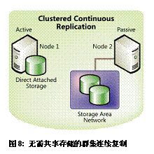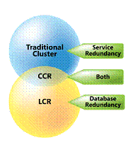 Exchange Server 2007提供了群集连续复制 (以下简称CCR)功能来为Exchange服务和信息存储提供冗余机制。与早期版本的Exchange中的群集解决方案类似,CCR使用Windows Clustering服务来提供虚拟服务器和故障转移功能。但是使用CCR,不再必须网络共享存储,每一个节点本身都有信息存储的一个拷贝。这种方式使客户可以实现多种存储选择,如直连式存储(Direct Attached Storage),串行连接SCSI(Serial Attached SCSI)以及存储区域网络(Storage Area Networks)。这种解决方案通过日志文件重演以实现连续复制,它与Microsoft® SQL Server™使用同样的连续复制机制。