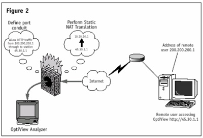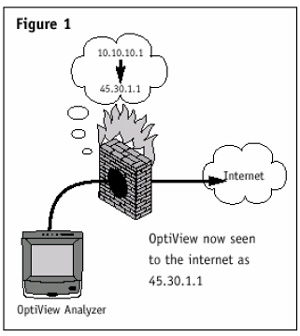 在图2中,主机200.200.200.1试图远程访问OptiView协议分析仪,防火墙会检查信息的匹配性,如果通过,会通过NAT转换了一个内部地址与OptiView 协议分析仪通信。