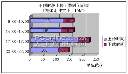 在邮件上传及下载速度测试中,我们分别选择了四个时间段,使用同一附件针对四个不同时间段在本域邮箱内分别做同一项测试,最后取其平均值作为测试结果。