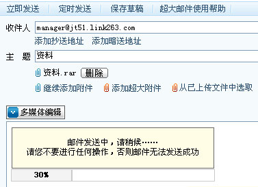 用户在实际使用中需要注意的是,在进行附件上传的过程中不能对所在浏览器页面进行任何操作,否则会导致邮件上传失败,另外,如果用户的客户端安装的防火墙或杀毒软件也有可能导致附件上传失败。
