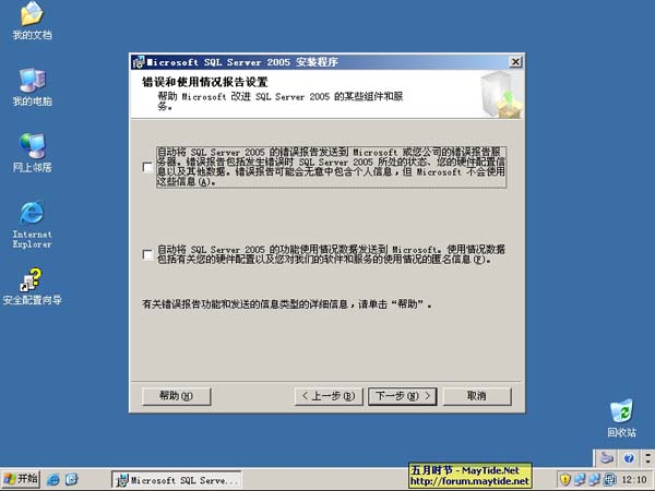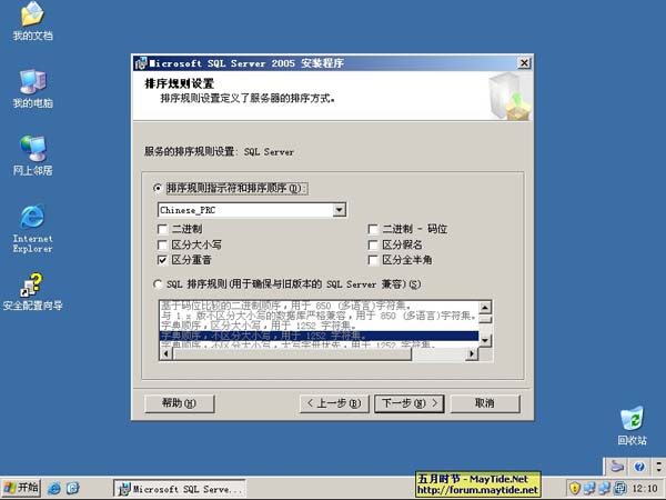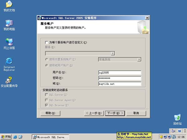 17、为服务配置帐户,之前我已经添加了一个名为sql2005的域用户作为SQL服务帐户,所以这里填写上正确的信息。
