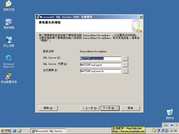 18、配置群集服务的域组,这里其实我到现在还没有彻底搞明白是什么意思,参看帮助文件,便在域中为每个SQL服务创建对应的全局组。(希望达人能够帮我解答一下此处的意义!)