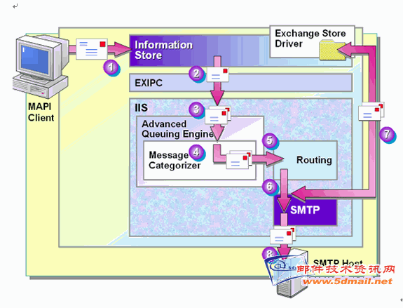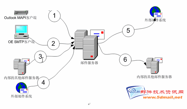 连接1,2,3,4代表了Inbound连接(其中连接1中的MAPI客户端是把邮件直接提交到Information Store中,不属于SMTP连接),当处理inbound连接时,图中的邮件服务器起到的是SMTP Server的角色。请注意,Inbound连接有两种类型,一种是客户端提交的邮件(连接2),这种通常表示组织内的用户通过在Outlook Express软件中指定SMTP服务器IP地址,来向服务器提交需要发送的邮件;另一种类型是其他的SMTP服务器转发过来的邮件(连接3,4),这通常表示当前邮件服务器是网关,或者是信件中收件人的邮箱所在的服务器。