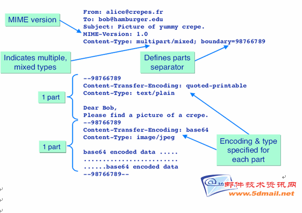 我们可能已经注意到,在RFC 821和1869中,我们定义了SMTP中用于建立连接和传输报文的命令字。在DATA命令后,我们可以传送由ASCII字符组成的数据流(即前面所提到的正文部分)到远端的SMTP主机,可这远远不能满足日常email通信的要求。邮件发送者往往需要在信件中使用非ASCII字符(例如,中文和其他非罗马字母语言),还需要插入各种类型的附件。为了能通过email发送非ASCII数据,IETF定义了多用途Internet邮件扩充MIME(Multipurpose Internet Mail Extension)标准。MIME并非为了改动SMTP或者取代它,而是允许使用ASCII码对任意数据进行编码,然后使用SMTP的DATA命令进行传送。