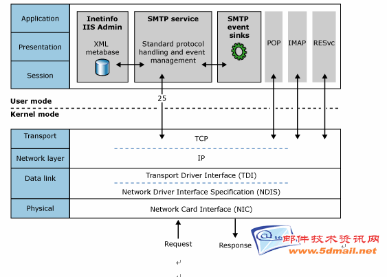 Exchange的SMTP之所以建立在Windows SMTP的基础之上,除了为了接管Windows SMTP原有的功能之外,另一个重要的原因是为了获得IIS所提供的安全、高效的网络通信平台。在IIS中,用户身份认证,底层网络通信这些模块已经完成并且技术成熟度也很高,因此不需要Exchange的开发者再重新花力气去另起炉灶。图五显示了SMTP在IIS和整个Windows平台中的位置。SMTP可以同时响应很多并发的连接,其中一个很重要的原因就是SMTP借助了IIS所提供的异步线程队列技术(Asynchronous Thread Queue),该技术允许并发连接可以被系统以平行、异步的方式高速的处理,在Windows平台上尽最大的可能性提高了系统的吞吐量。