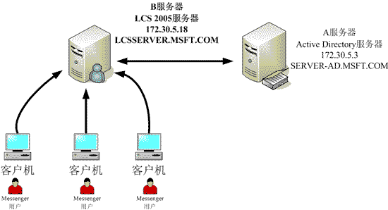 如图1所示,在这种企业局域网中,LCS作为企业内部传递消息的服务器,不与外部用户进行交流。本文将介绍此种模式下LCS的部署和配置。