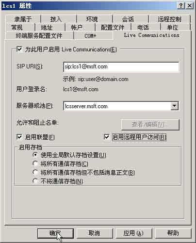 然后选择用户,用鼠标右键单击,在出现的菜单中选择“属性”,在lcs1属性页中,单击“Live Communications”选项卡,选中“为此用户启用live Communications”,并在“SIP URI”字段后面输入用户的邮件地址(以sip:前缀开头)。然后在“服务器”栏的下拉列表中选择LCS的服务器的名称,单击“确定”按钮(图3)。参照这个方法,为其他用户启用Live Communications功能。