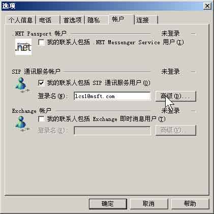 在Windows Messenger主界面中,打开“选项”页面(图4)。单击“账号”选项卡,在此页中,可以配置三个服务,即.Net Passport、SIP、Exchange IM账号,在此我们只使用LCS的客户端即SIP账号。选中“我的联系人包括SIP通讯服务用户”,然后在“登录名”栏输入SIP账号名(如lcs1@wldhj.com),然后单击“高级”按钮。