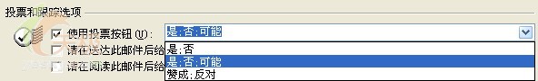 运行Outlook,打开“邮件”,单击工具栏中“新建→邮件”,在打开的新邮件窗口中按常规填写相应内容并书写邮件正文,单击工具栏中的“选项”按钮,打开“邮件选项”窗口,勾选“使用投票”按钮,并在其后的下拉列表中选择按钮内容(图1),最后发送该邮件。