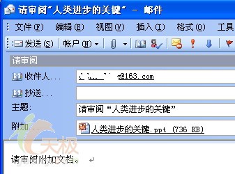 编辑好一篇Office文档(如Word、Excel、Powerpoint),想请远方的好友修改一下,我们可以利用Outlook发送要求审阅的邮件。以审阅PPT幻灯片为例:在Powerpoint中打开PPT文件,单击菜单“文件→发送→邮件收件人(审阅)”,会出现Outlook的新邮件窗口,幻灯片已自动添加为附件(图4),填上收件人地址后单击“发送”按钮,把需要审阅的文档发出。